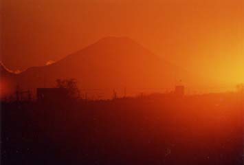 | 富士暮色 私の住まいの近所からこんな富士が眺められる。 実際に見える富士はもっと小さいが、300ミリの望遠レンズで引き 寄せるとこのように見える。 この場所での富士撮影はこれからの季節が良くて、暮れから正月 にかけてがいちばんだ。 |
