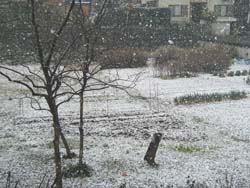 | 2004年3月20日(土)埼玉地方の天気:雨時々雪 最近はどうも天気が安定しなくて暖かかったり寒かった り変化が著しいが、今日は朝からどんよりとした雲行き で昼前から雪が降り出した。 雪といっても3月の雪であるからぼた雪もいいところ で積もるはずもないが、しばらくすると写真のように うっすらとした雪景色になった。 寒いワケだ。 せっかく桜の開花宣言も出たというのにこの寒さ では桜だって咲きようがないが、開花の後に寒い 日があると桜の花は長持ちするらしい。 何とか来週の週末まで咲いていて欲しい。 毎年この時期になると桜の花を写真に収めるのだが、 休日と桜の開花時期が上手く合致することが なかなかなくて良い写真が撮れない、・・・・・と 自分の腕を棚に上げて責任転嫁してしまうのだ。 だが真面目な話、花というのは何でもそうだが 8分咲き位の時が一番良い。 満開になってしまうと早めに咲いた花が枯れか けたりしていて絵ヅラが悪くなるのだ。 それに人間の心理としては8分咲き位の時に 満開と感じて、本当に満開の時には「少し散り かけてる」と感じるらしい。 そんな所に過ぎゆく時間を惜しむ心理が我々には あるのだと聞いた事がある。 というワケで、後で後悔しないように今のうちにやりたい 事をやっておこうと力強く思った次第です。 |